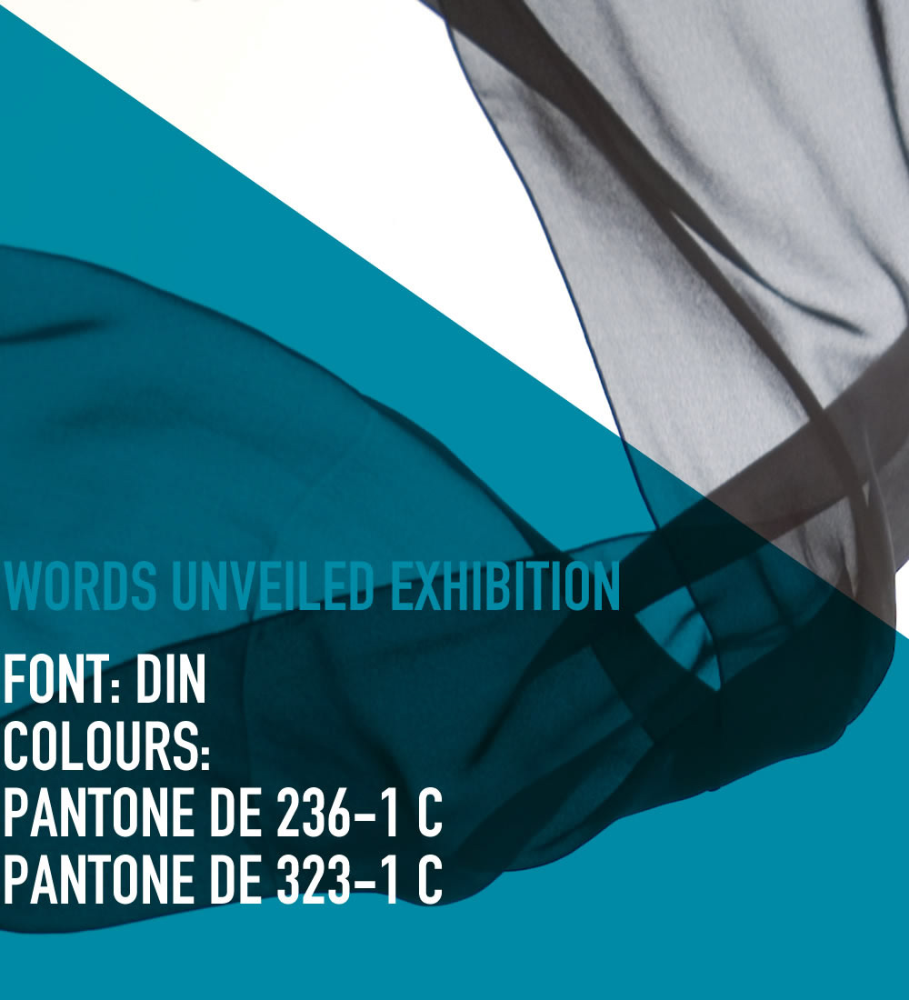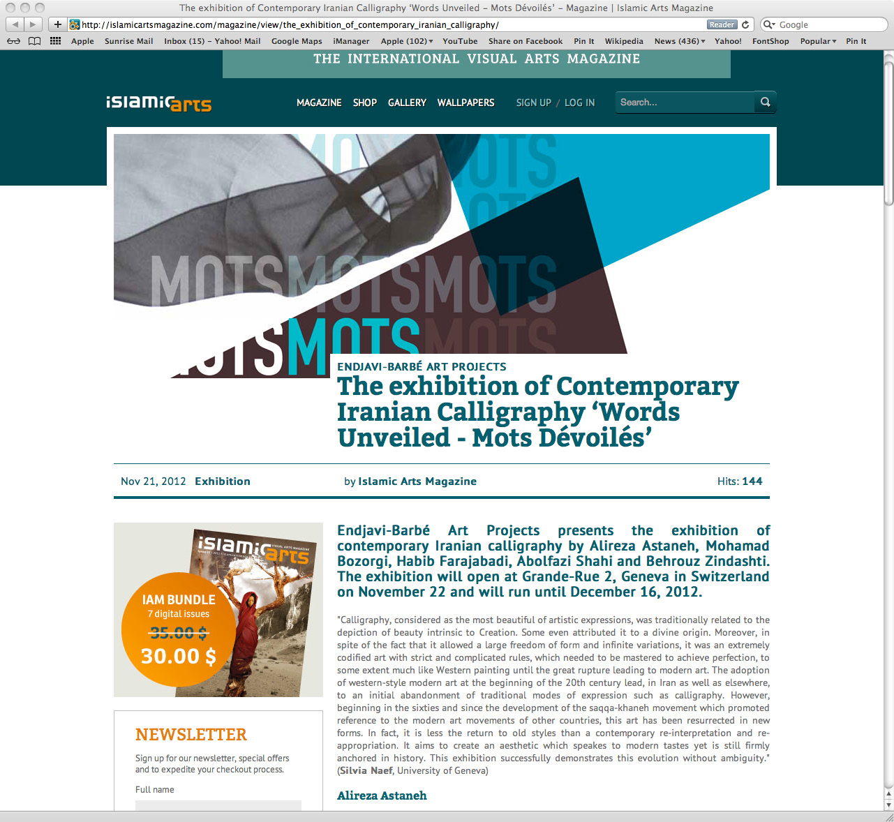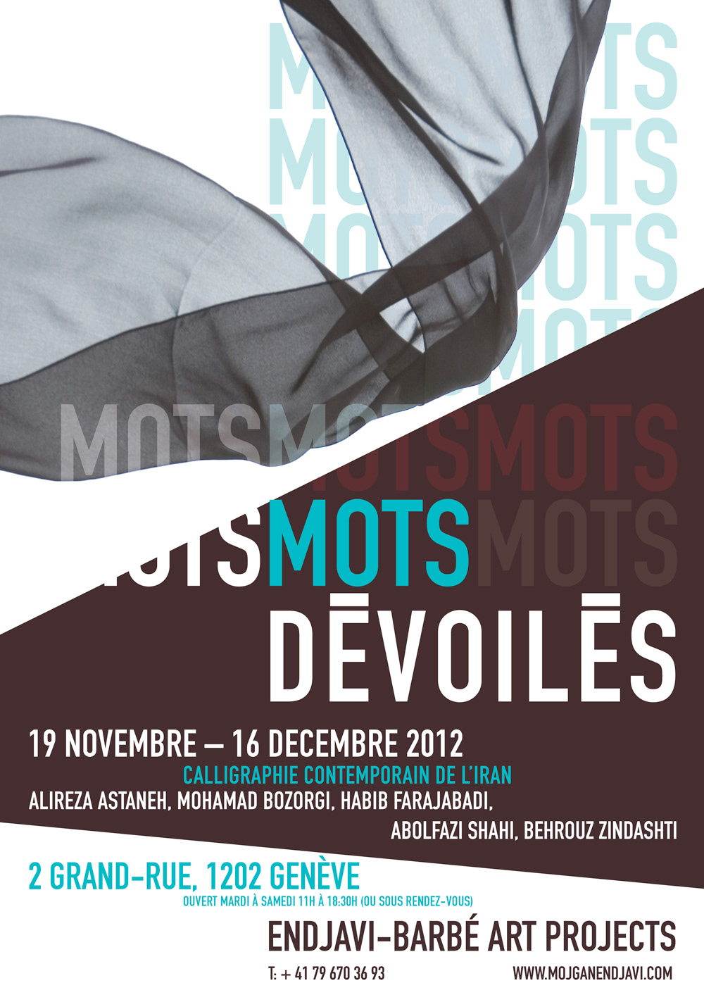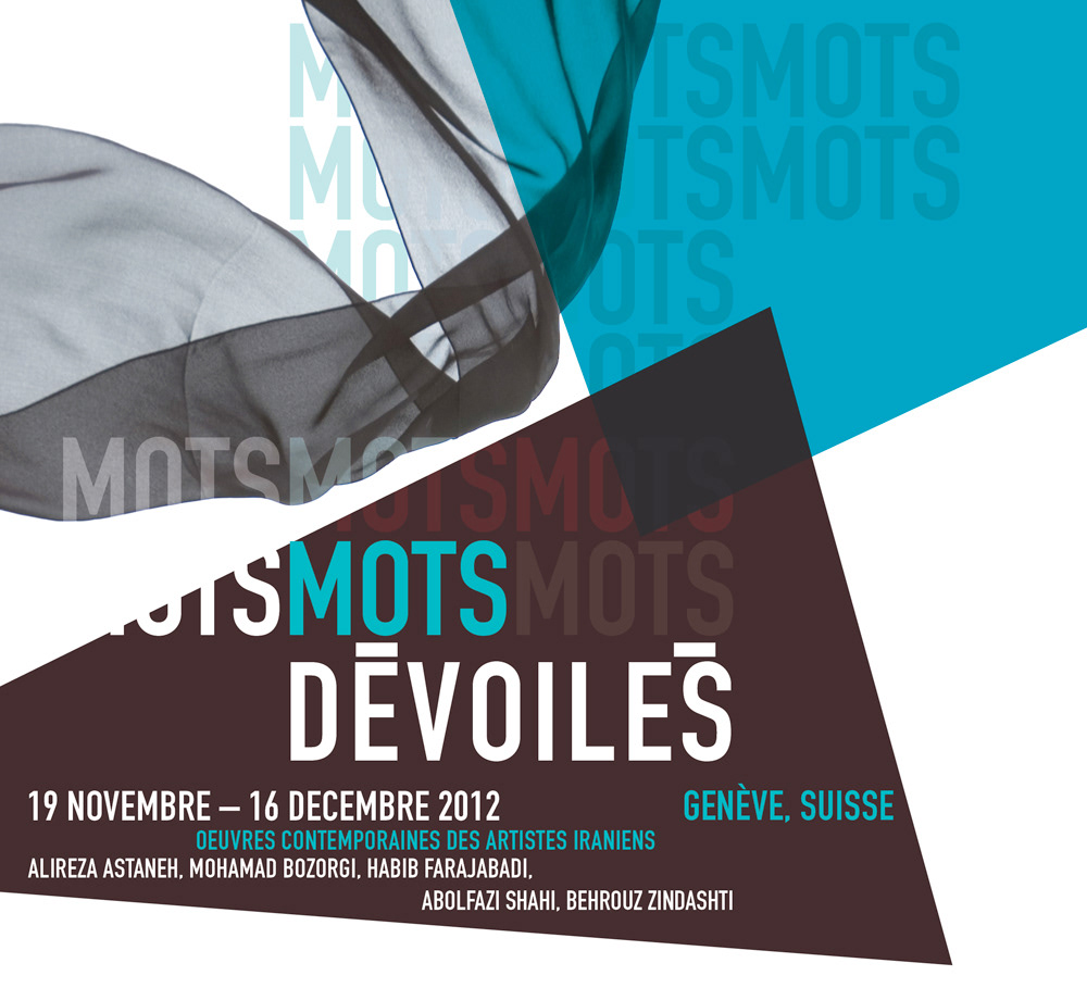 Poster and catalog for the "Words Unveiled" exhibition in Geneva, Switzerland, The exhibition features the work of contemporary Iranian artists (Alireza Astaneh, Mohammad Bozorgi, Habib Farajabadi, Abolfazi Shahi and Behrouz Zindashti).